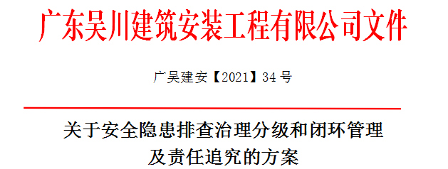 為建立安全隱患排查治理長效機(jī)制,強(qiáng)化安全生產(chǎn)主體責(zé)任,加強(qiáng)安全隱患治理,防止和杜絕事故發(fā)生,保障施工項目的安全生產(chǎn),現(xiàn)結(jié)合公司的實際,特制定安全隱患排查治理分級和閉環(huán)管理及責(zé)任追究的方案。
