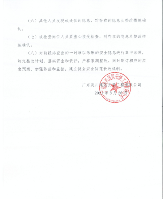 (二)重大安全隱患整改結(jié)束后,由分公司主要領(lǐng)導(dǎo)組織初驗、項目部主要負(fù)責(zé)人組織最終驗收、銷號。