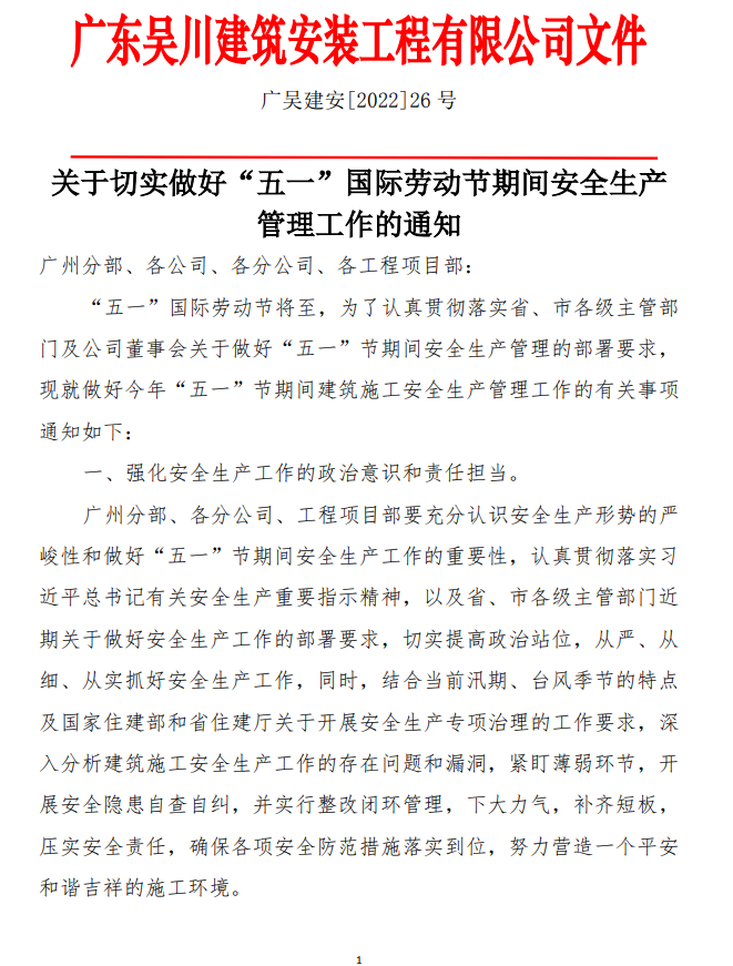 關于切實做好“五一”國際勞動節(jié)期間安全生產(chǎn)管理工作的通知